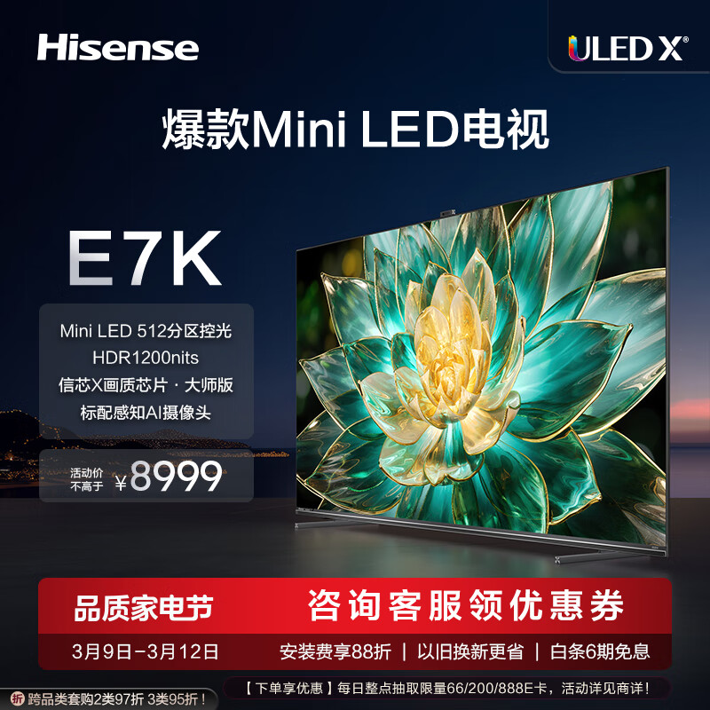 海信电视85E7K 85英寸 ULED X Mini LED 512分区 AI摄像头超感知 智慧屏 液晶智能平板电视机 以旧换新价格:8999.00元!