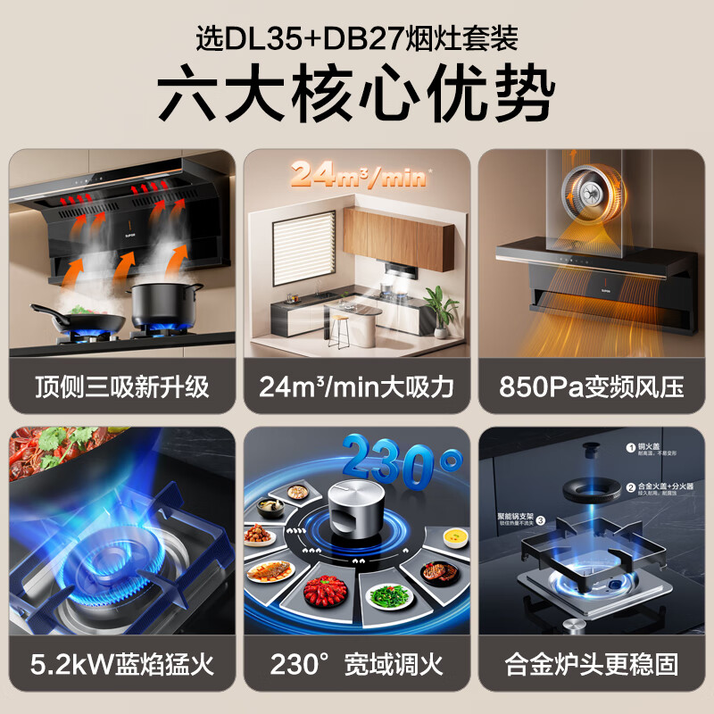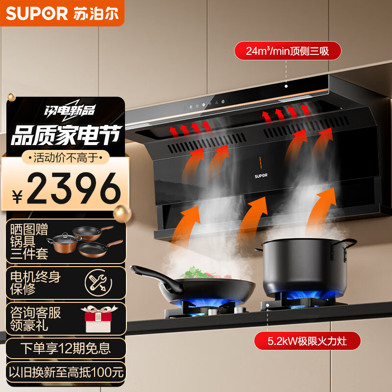 苏泊尔(SUPOR)抽油烟机 双腔拢烟顶侧双吸油烟机灶具套装 24立方大吸力变频烟灶 家用油烟机燃气灶 DL35+DB27天价格:2396.00元!