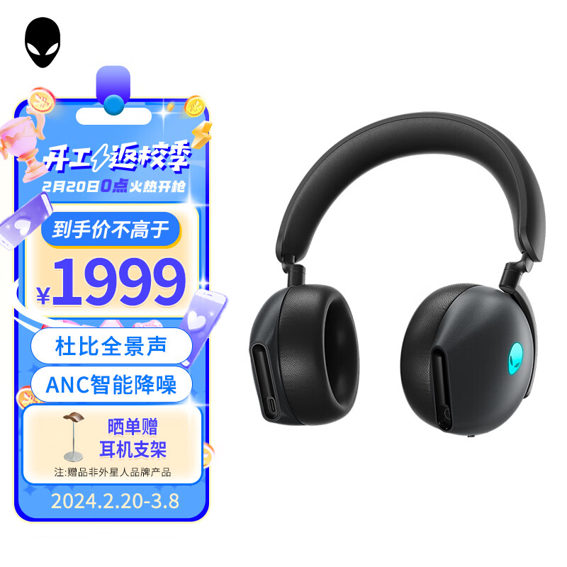 外星人(Alienware)电竞蓝牙游戏耳机头戴式智能降噪杜比全景声电脑手机无线耳麦兼容 AW920H 黑价格:1999.00元!