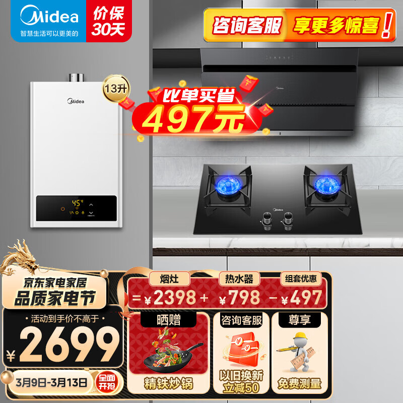 美的(Midea)侧吸抽油烟机灶具烟灶多件套装燃气热水器家用烟灶燃热厨房三件套JN205+Q330+13HWF天然气价格:2699.00元!