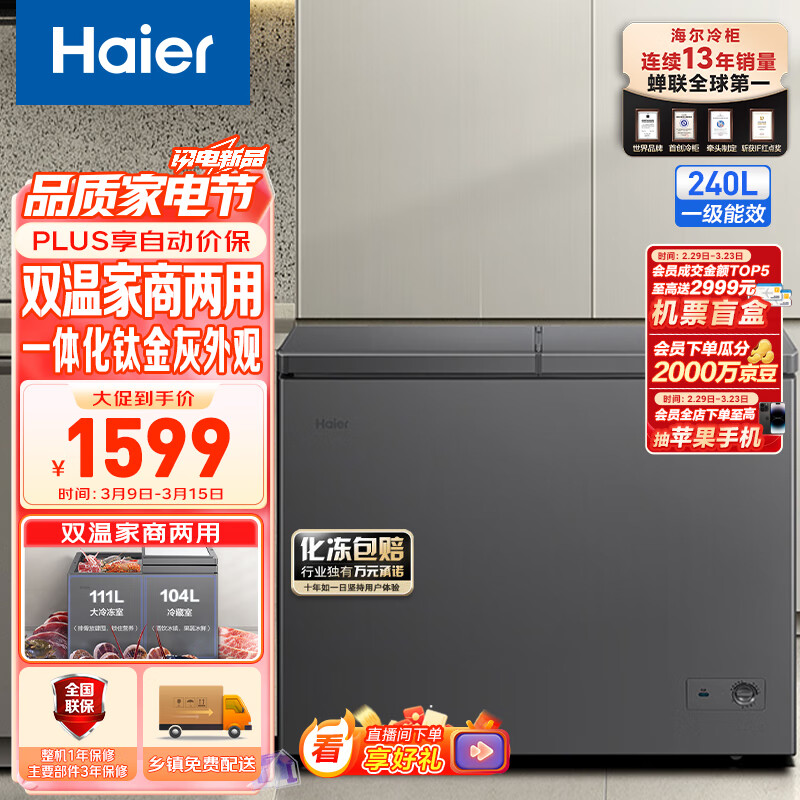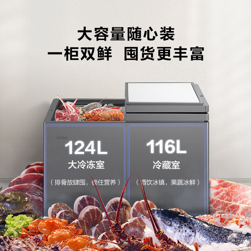 海尔(Haier)240升双箱双温家用商用冰柜 蝶门卧式冷藏柜冷冻柜冰柜家用小型冰箱冷柜FCD-240LHSCD 以旧换新价格:1521.40元!