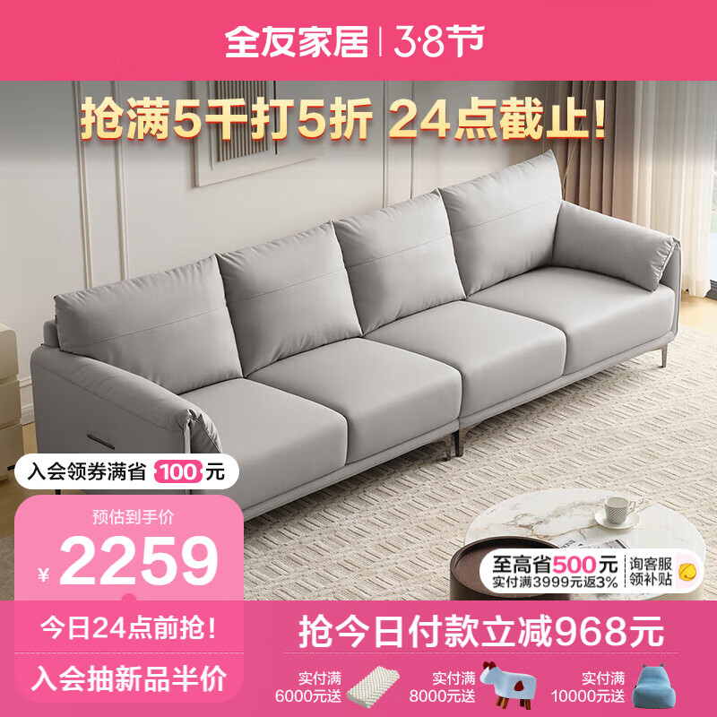 全友家居 客厅意式极简科技布三人位直排一字大象耳朵布艺沙发111090价格:3227.14元!