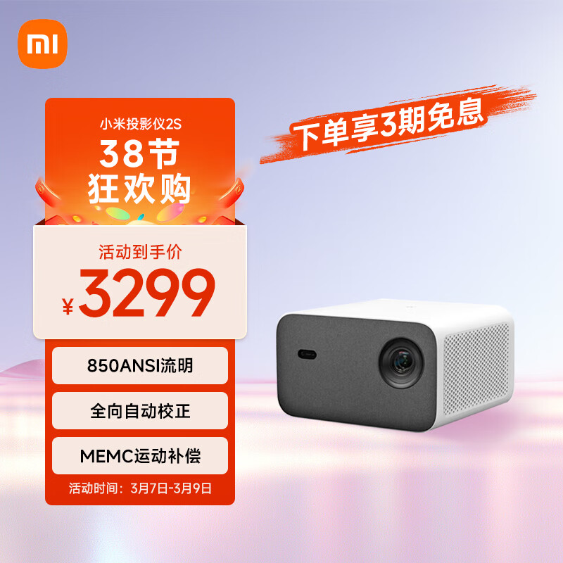 小米投影仪2S 投影仪家用 家庭影院 (MEMC运动补偿、全向自动校正、智能家居互联)价格:3099.00元!