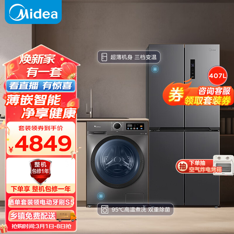 美的(Midea)61cm薄407升十字双变频冰箱BCD-407WSPZM(E)+小天鹅10公斤除菌净螨洗衣机TG100APURE 冰洗套装价格:5104.00元!