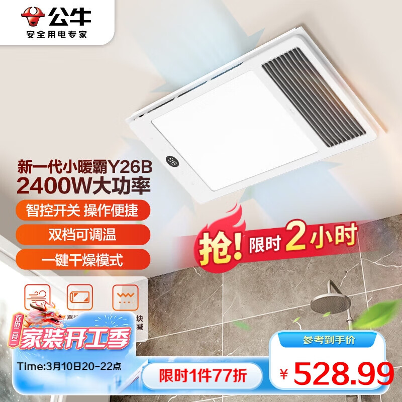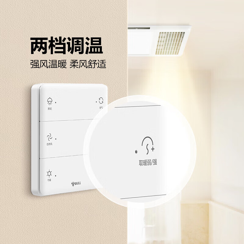 公牛(BULL)浴霸浴室2400W双档取暖GY26BQT温度显示超大灯板一键干燥价格:687.00元!