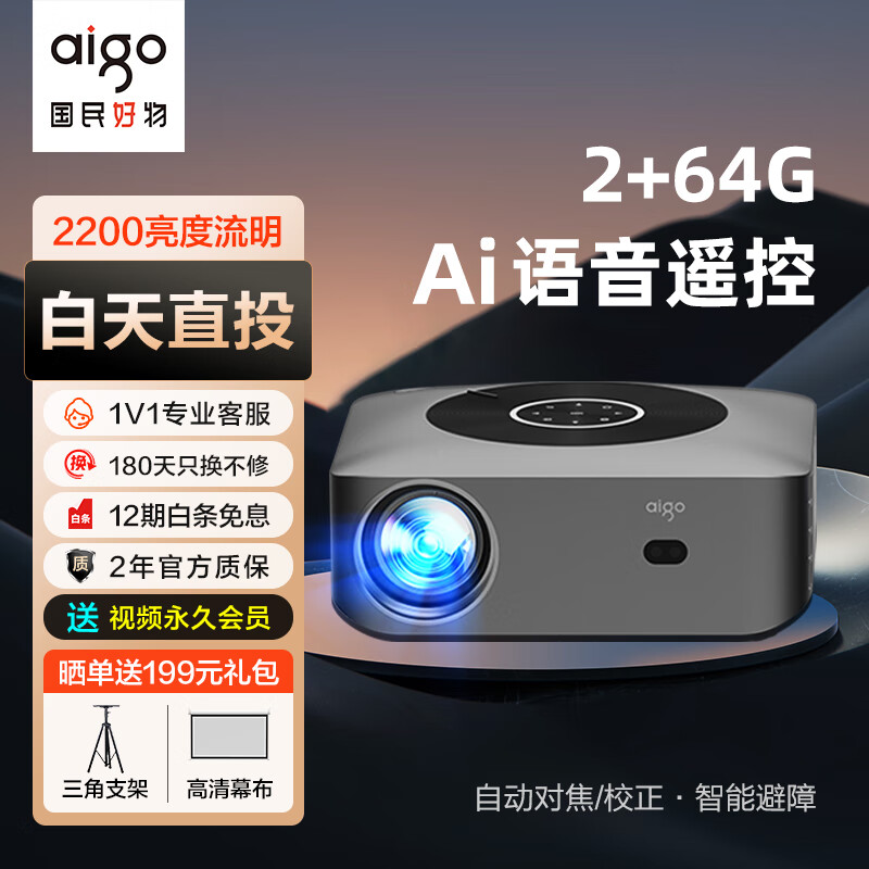 爱国者 H68投影仪家用1080P高清办公投影机家庭影院(2200亮度流明 2+64G内存 自动对焦校正 智能避障)价格:1499.00元!