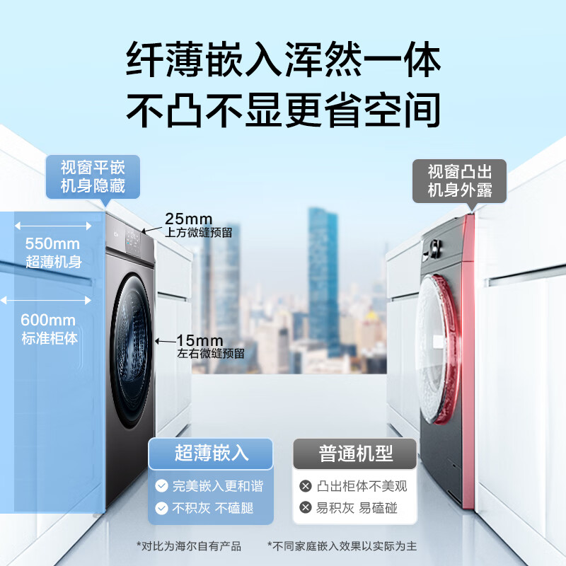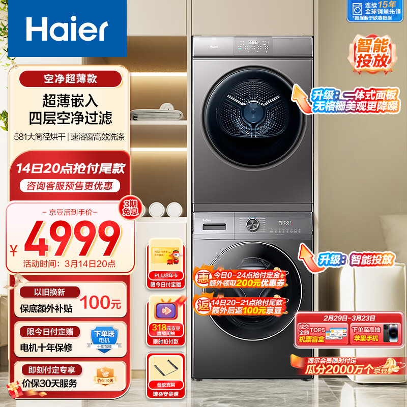 海尔(Haier)超薄全嵌洗烘套装 10Kg滚筒洗衣机+热泵烘干机家用 智能投放 双喷淋 EG100MATE55+EHG100MATE36S价格:5298.00元!