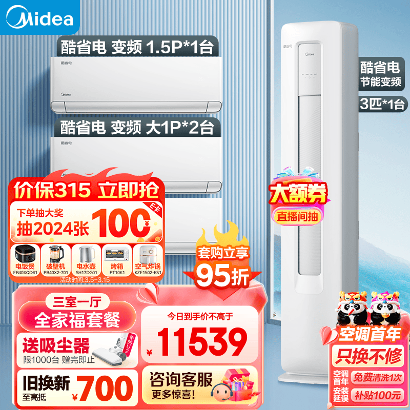 美的(Midea)新能效 酷省电 空调套装 三室一厅 全家福套餐(大1匹*2+1.5匹+3匹)价格:12146.00元!