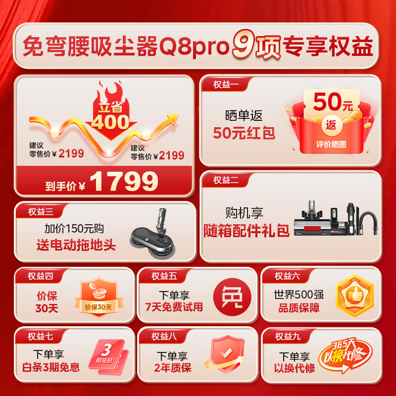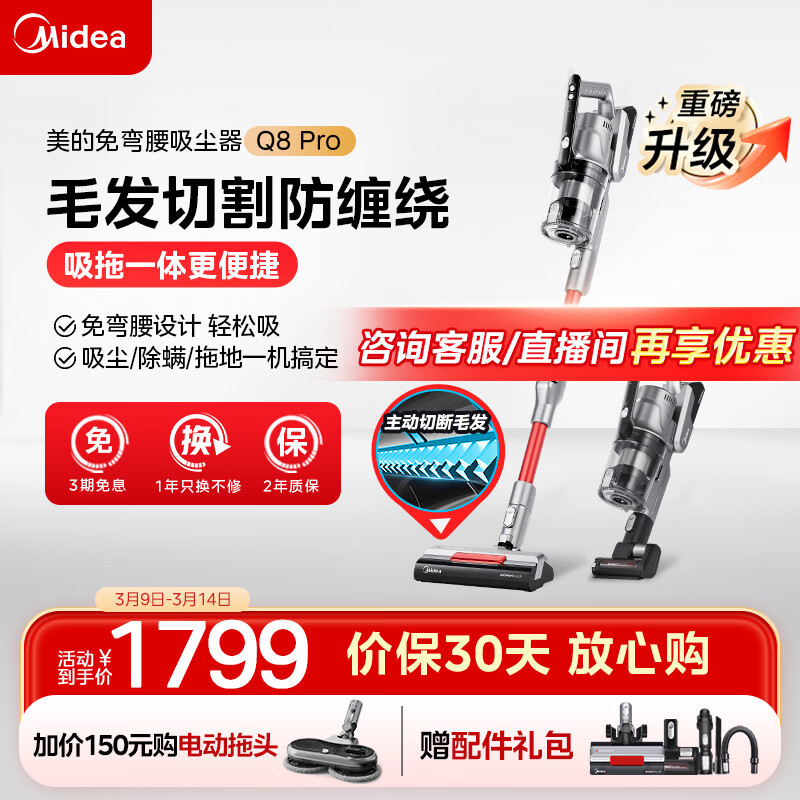 美的(Midea)吸尘器家用手持无线Q8 Pro 洗地机吸拖一体机 除螨仪宠物地毯除螨吸尘器价格:1799.00元!