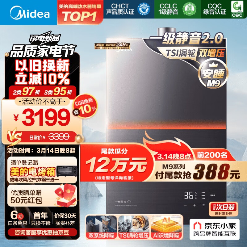 美的(Midea)安睡M9系列16升燃气热水器天然气 一级静音2.0变频水伺服 四段微火恒温 TSI涡轮增压JSQ30-M9 Max价格:3199.00元!