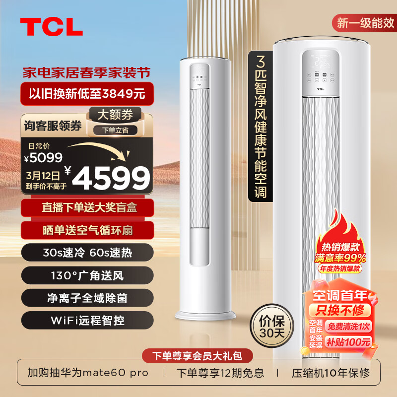 TCL空调 3匹 新一级能效 变频冷暖 智能 智净风 除菌客厅空调立式空调柜机KFR-72LW/JV2Ea+B1以旧换新价格:4599.00元!