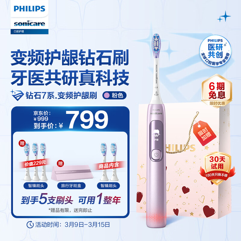 飞利浦(PHILIPS)电动牙刷情侣款 送女友/男友 结婚礼物5种模式智能显示屏2支护龈刷头钻石7系樱花粉价格:799.00元!