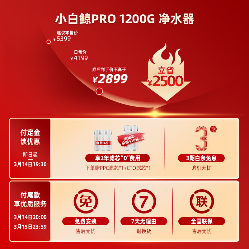 沁园(TRULIVA)小白鲸pro大通量1200G家用净水器5年RO反渗透厨下直饮3.3L/分钟 UR-S51246i价格:2999.00元!