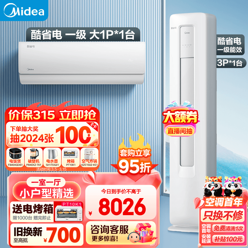 美的(Midea)新一级能效 酷省电 空调套装 一室一厅 小户型精选(大1匹酷省电+3匹酷省电)价格:8448.00元!