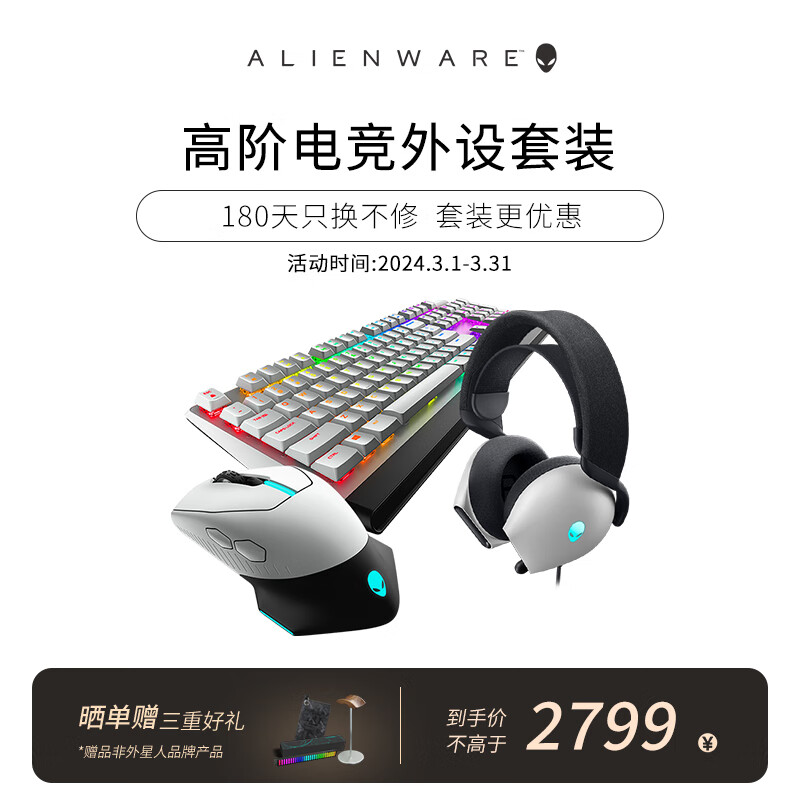 外星人(Alienware)610M+510K+520H 游戏电竞三件套(无线游戏鼠标 有线机械键盘 电竞耳机)RGB高端外设送礼物白色价格:2799.00元!