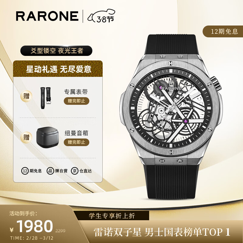 雷诺(RARONE)双子星·X时轮全景镂空机械表夜光国表品牌男士腕表价格:2199.00元!