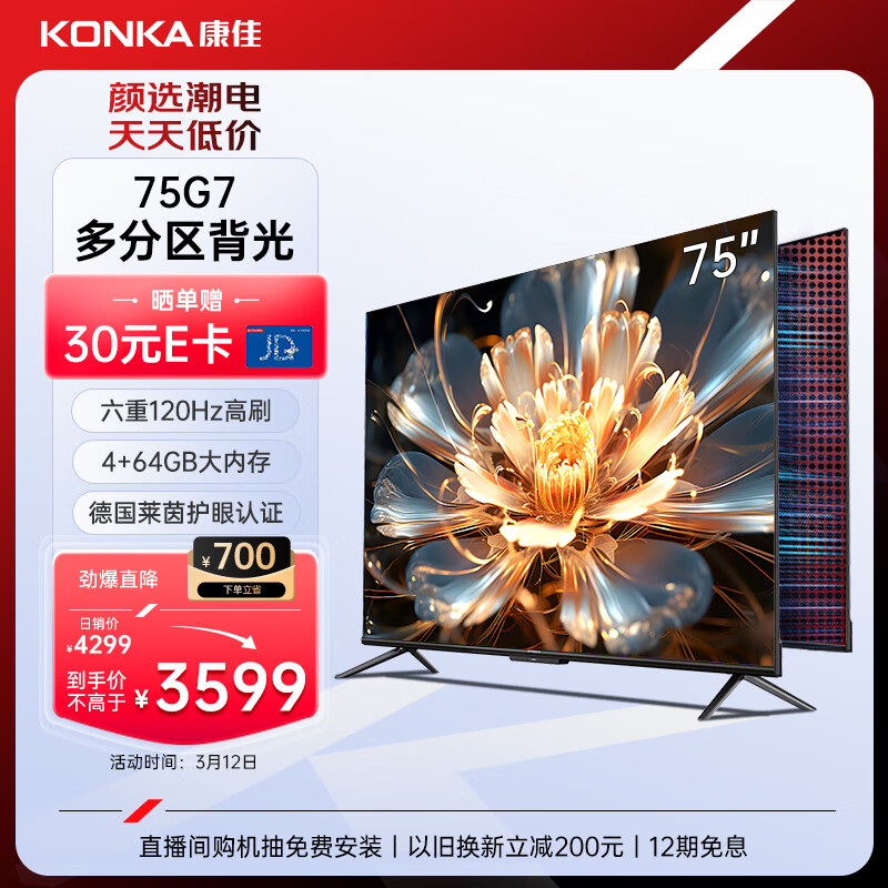 康佳电视 75G7 75英寸多分区背光 120Hz MEMC 4+64G 4K超清屏巨幕液晶平板游戏电视机巨幕以旧换新价格:3599.00元!