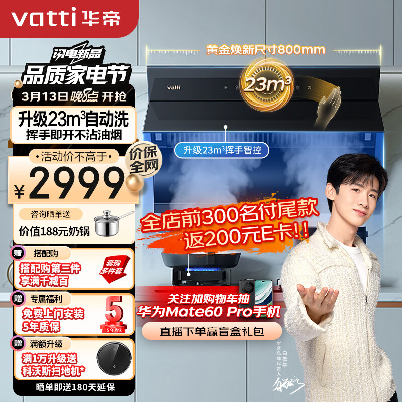 华帝(VATTI)抽油烟机家用大吸力小尺寸烟机燃气灶烟灶套装23风量自动清洗侧吸吸油烟机灶具套装i11170天然气价格:2998.00元!