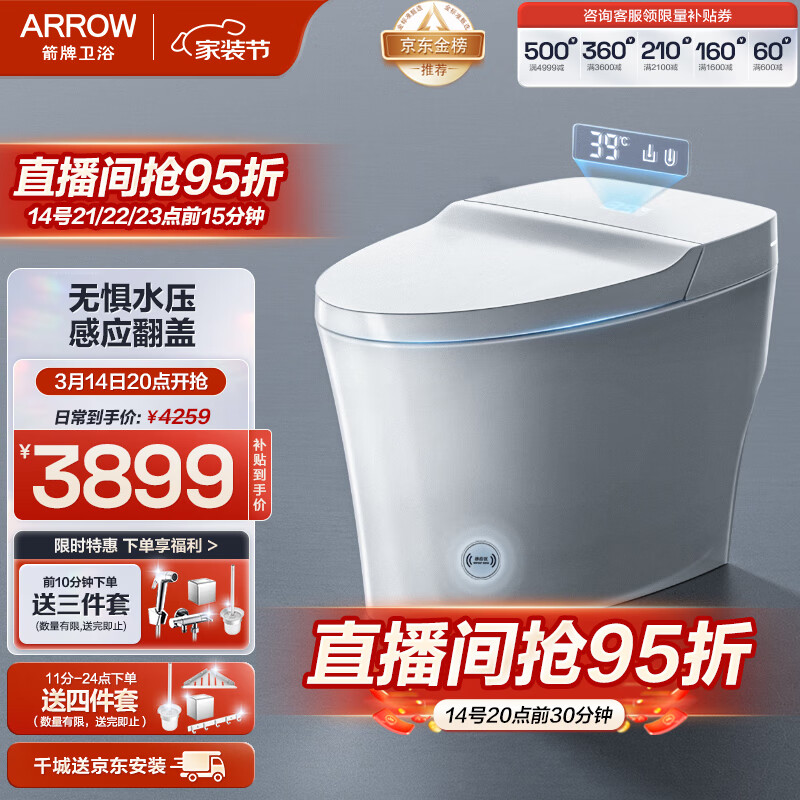 箭牌(ARROW)智能马桶恒温座圈按摩加热坐便器 低水压脚感翻盖翻圈AKE1135M价格:6255.00元!