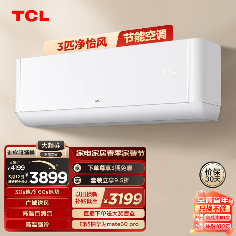 TCL空调 3匹 新三级能效 变频冷暖 净怡风 大风量 卧室壁挂式空调挂机KFR-72GW/JQ2Ea+B3以旧换新价格:3899.00元!