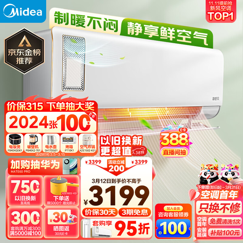 美的(Midea)新风空调 1.5匹 静新风 新一级能效 变频冷暖除湿 壁挂式空调挂机 KFR-35GW/N8XF1-1定制版价格:3199.00元!