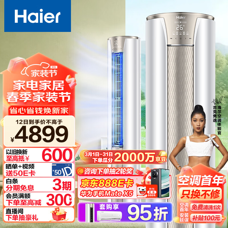 海尔(Haier)3匹 静悦 新能效变频客厅家用空调立式柜机 自清洁 京东小家智能 KFR-72LW/06KCA83U1 以旧换新价格:4799.00元!