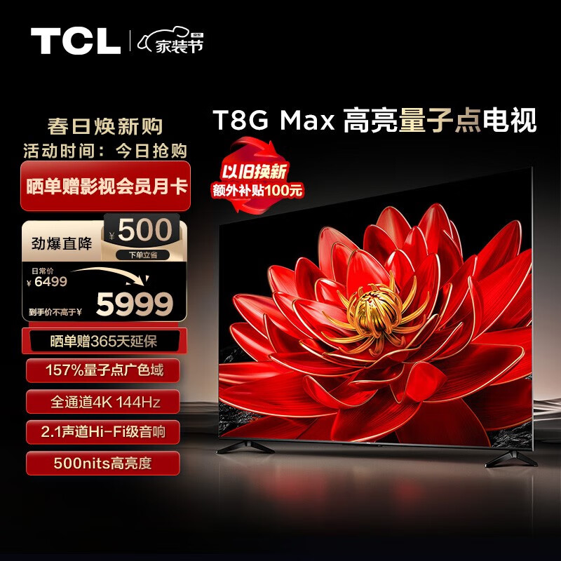 TCL电视 85T8G Max 85英寸 QLED量子点 4K 144Hz 2.1声道音响 4+64GB 客厅液晶智能平板游戏电视机价格:5999.00元!
