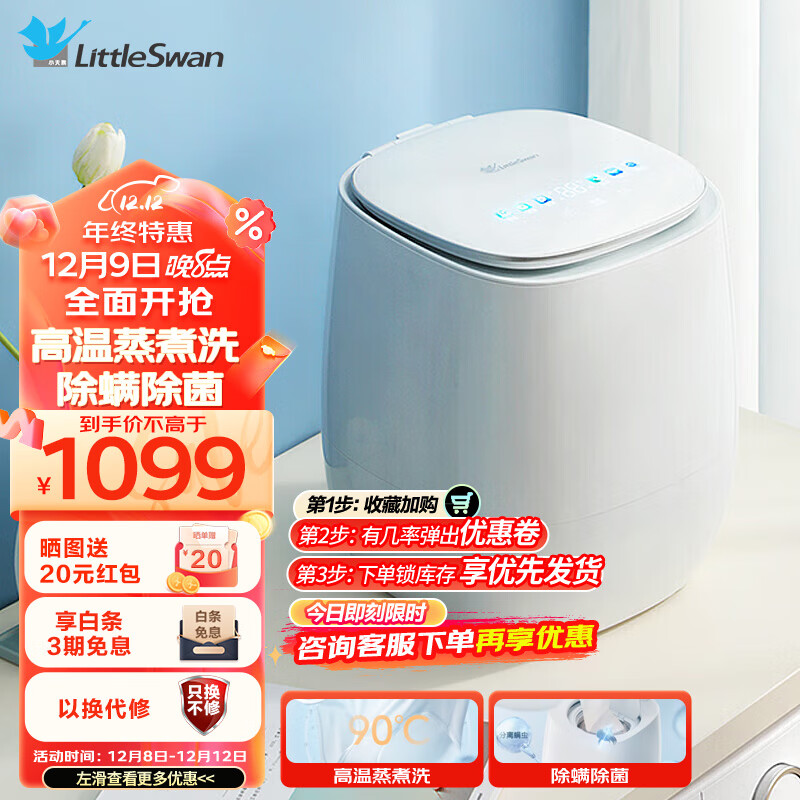 小天鹅(LittleSwan)0.5KG内衣洗衣机 迷你波轮全自动婴儿洗衣机 高温蒸煮洗除菌除螨 灵动炫彩屏不锈钢内桶 TNB5VD0WE价格:1099.00元!