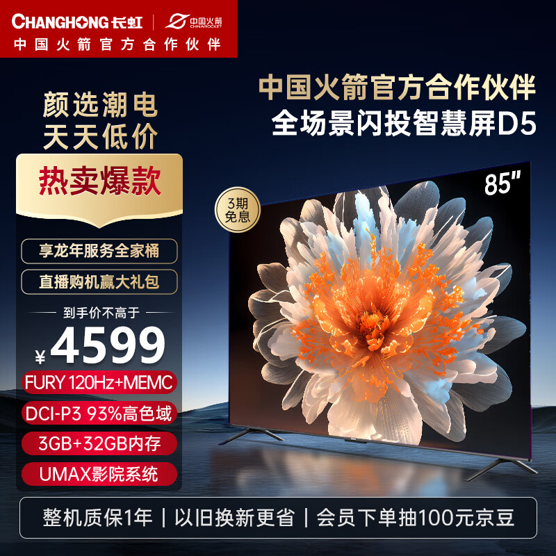 长虹电视85D5 85英寸4K超清120Hz高刷 3+32GB 93%P3高色域 杜比音画 智能平板液晶LED电视机 以旧换新价格:4598.00元!