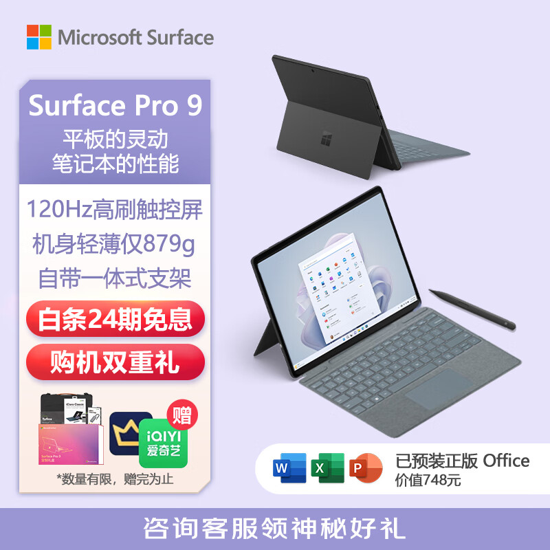 微软Surface Pro 9 石墨灰+冰晶蓝带触控笔键盘盖i7 16G+512G 二合一平板电脑13英寸120Hz触控屏办公本价格:16688.00元!