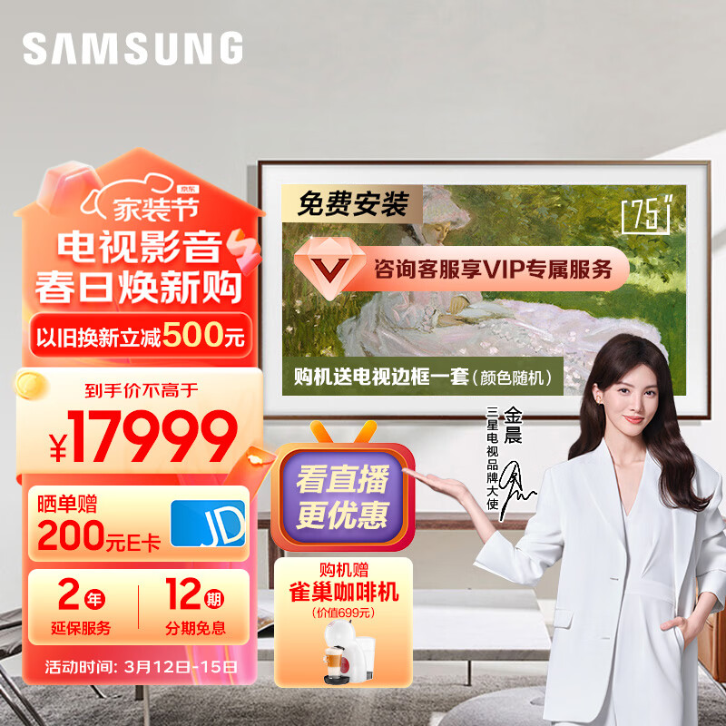 三星(SAMSUNG)75LS03C 75英寸 frame画壁艺术电视 120Hz QLED量子点 超薄4K 空间美学 QA75LS03CAJXXZ价格:17999.00元!