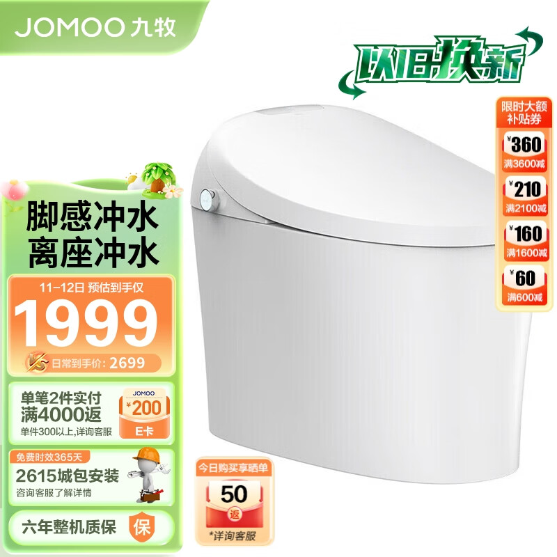 九牧(JOMOO)智能马桶一体机数显脚感冲水智能坐便器ZS520X-400坑距绿色家居价格:4159.00元!
