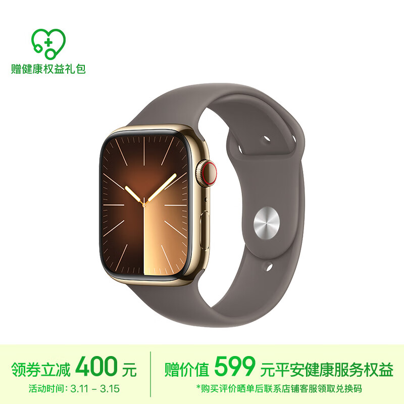 Apple/苹果 Watch Series 9 智能手表GPS+蜂窝款45毫米金色不锈钢表壳陶土色运动型表带M/L MRPL3CH/A价格:6199.00元!