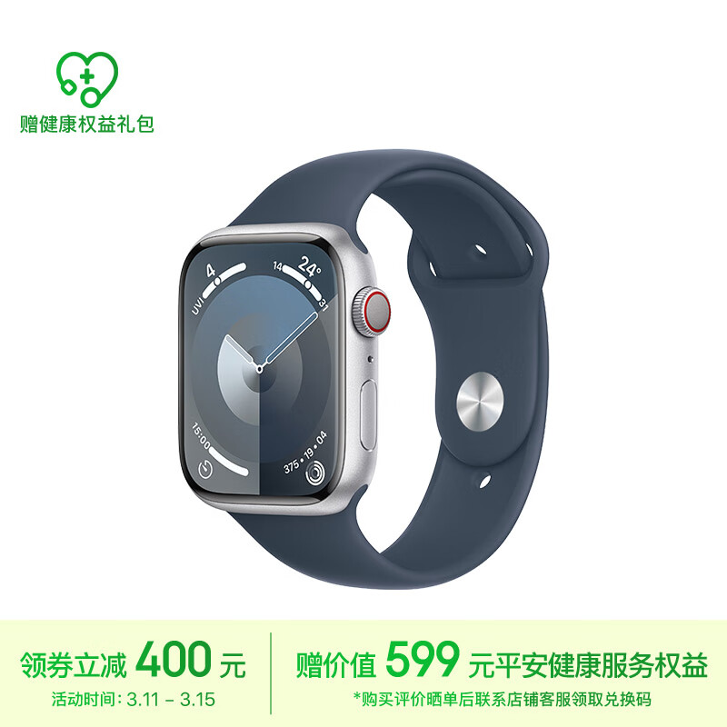 Apple/苹果 Watch Series 9 智能手表GPS+蜂窝款45毫米银色铝金属表壳风暴蓝色运动型表带M/L MRP93CH/A价格:3999.00元!