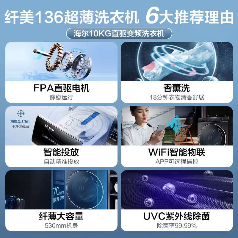 海尔(Haier)滚筒洗衣机 10公斤超薄直驱变频洗衣机洗烘一体 智能投放紫外线除菌 525mm大筒径以旧换新价格:4299.00元!