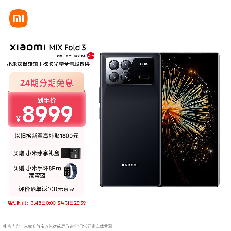 小米(MI)Xiaomi MIX Fold 3 小米龙骨转轴 徕卡光学全焦段四摄 12GB+256GB 月影黑 小米折叠屏手机5g价格:8999.00元!