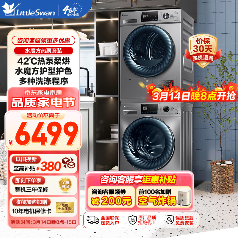 小天鹅(LittleSwan)小天鹅水魔方洗烘套装 10KG全自动变频家用洗衣机 护衣除菌烘干机 烘被子防缠绕 868+868价格:6499.00元!