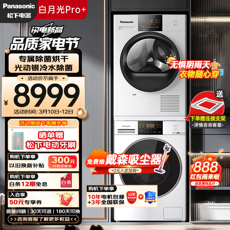松下(Panasonic)洗烘套装 白月光Pro+ 10kg滚筒洗衣机+热泵烘干机 光动银除菌 1.1洗净比 羽绒服烘 3E1AK+EH31JW价格:8999.00元!