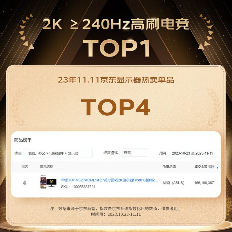 华硕战杀VG27AQML1A 27英寸显示器2K 240Hz显示器电竞FastIPS超频260Hz G-sync兼容1msGTG响应HDR400价格:2399.00元!