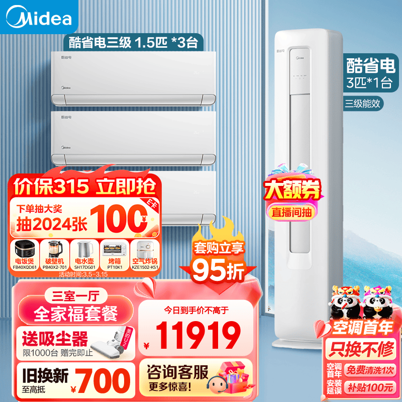 美的(Midea)新能效 酷省电 空调套装 三室一厅 全家福套餐(1.5匹*3+3匹)价格:12546.00元!