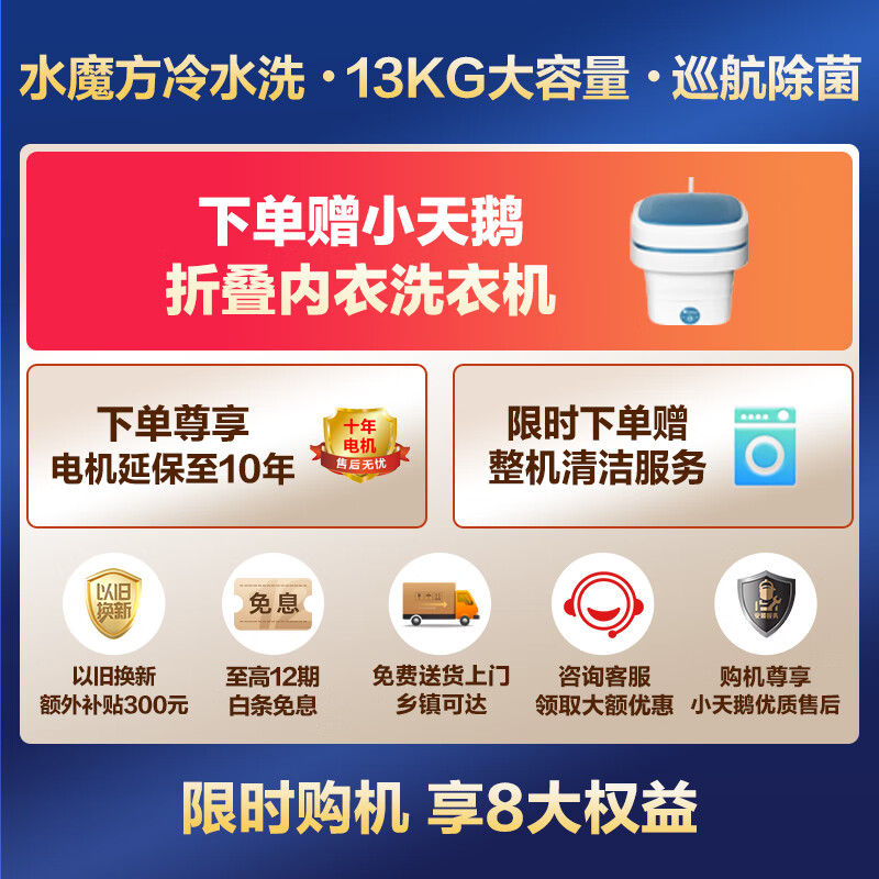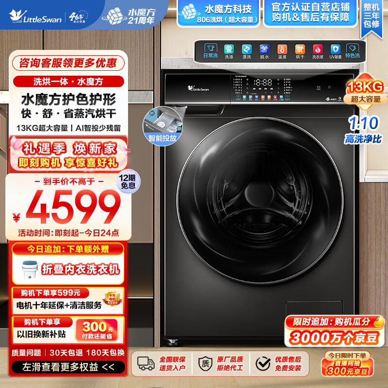 小天鹅(LittleSwan)滚筒洗衣机全自动 水魔方【TD130V806MIT】洗烘一体 冷水洗 1.1洗净比 彩屏智投放 超大容量13公斤价格:4599.00元!