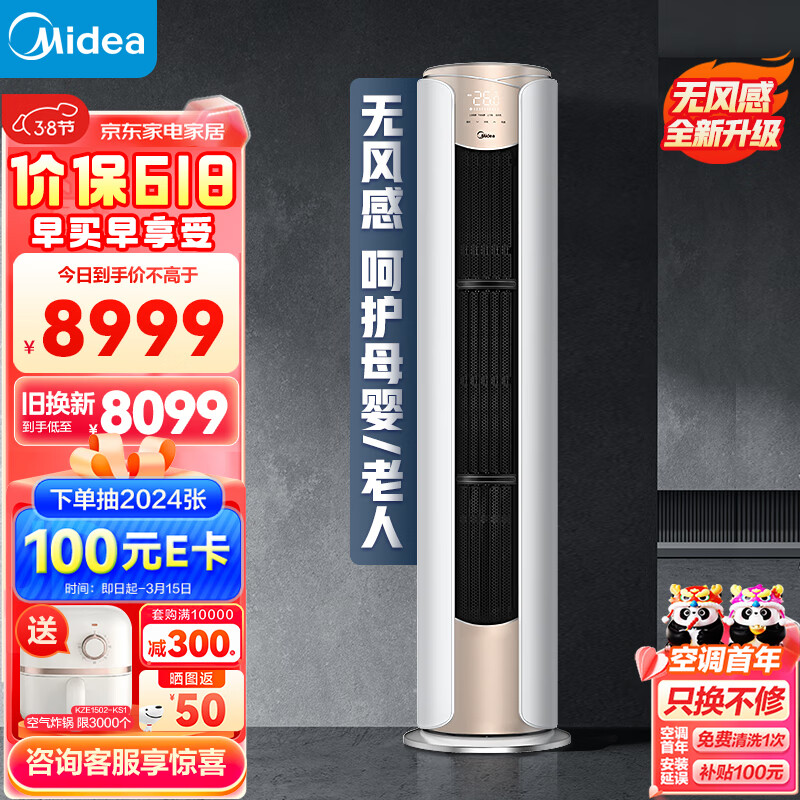 美的(Midea)空调 3匹 纤白 新一级 变频冷暖 独立除湿 京东小家 客厅立式 空调柜机 无风感 KFR-72LW/N8MWD1价格:8999.00元!