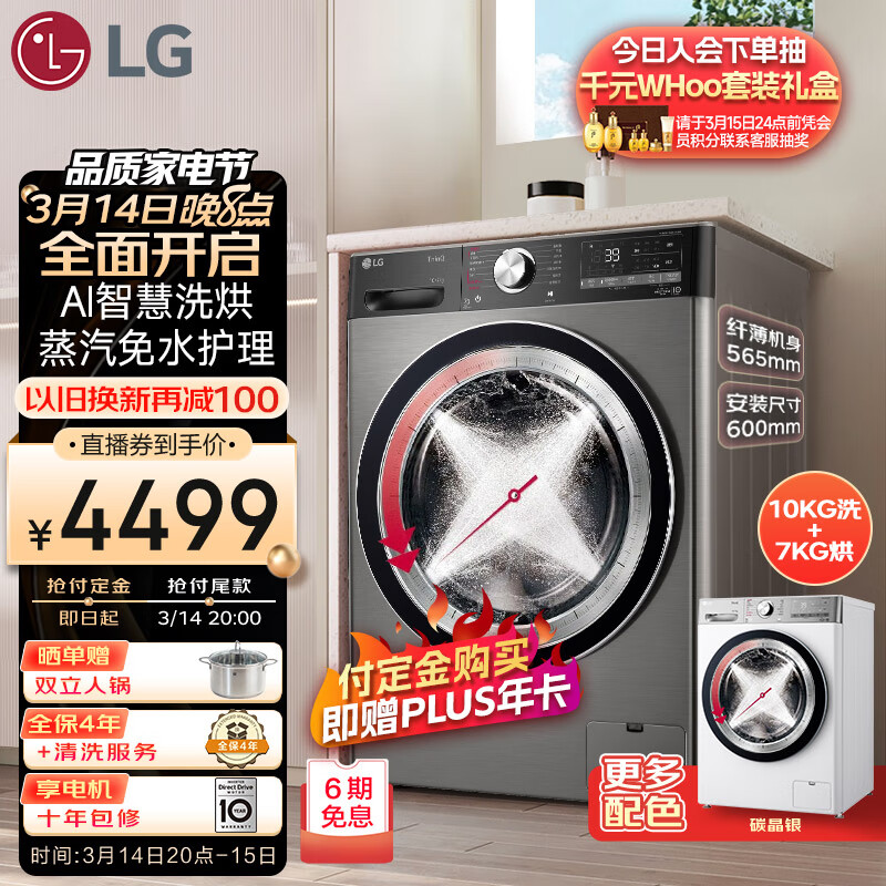 LG小旋风系列 10KG超薄洗烘一体机家用 直驱变频 旋风速净洗 蒸汽除菌 360°速净喷淋 银 FCW10D4PA价格:4598.00元!