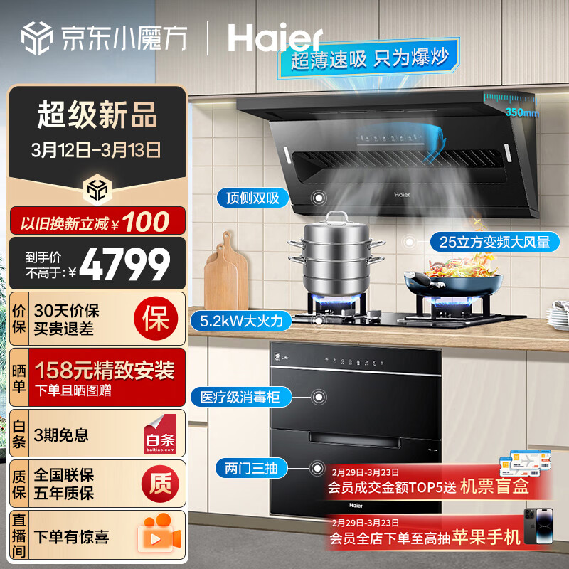 海尔(Haier)抽油烟机 顶侧双吸油烟机燃气灶消毒柜套装 25m3/min大吸力 115L医疗级消毒柜C61+Q2BE3天+E07JU1价格:4799.00元!