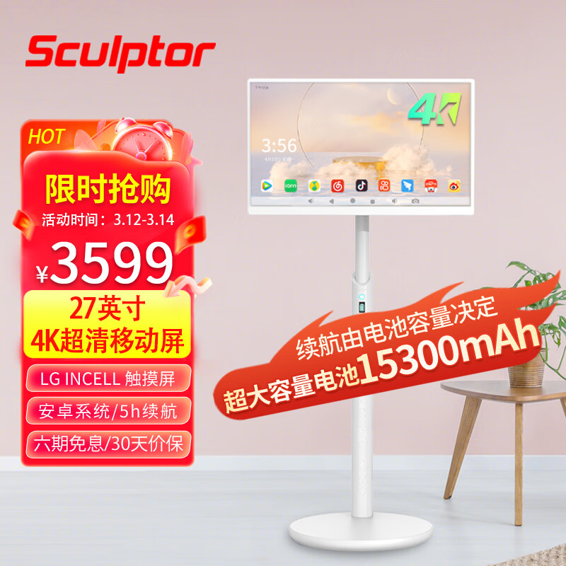 雕塑家 4K移动随心屏 闺蜜机大电池长续航 智慧屏27英寸IPS移动屏 触摸屏幕平板电视安卓系统显示器价格:3649.00元!