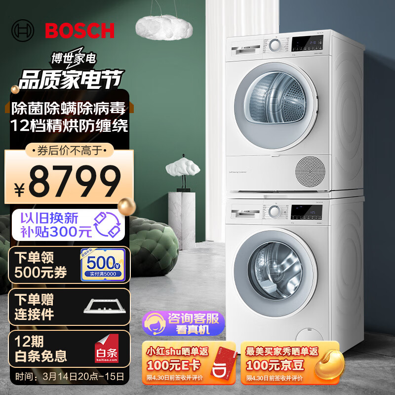 博世(BOSCH)洗烘套装10+10KG云朵白大容量全自动滚筒除菌洗衣机家用热泵烘干机除菌除螨柔洗羊毛152000+254D00价格:10299.00元!