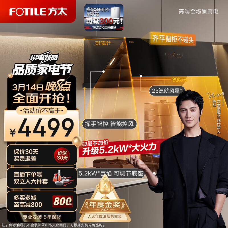 方太(FOTILE)抽吸油烟机灶具套装 侧吸式变频烟灶23大风量智能巡航挥手5.2kW燃气灶01-JCD10TA+02-TH27B天然气价格:4499.00元!