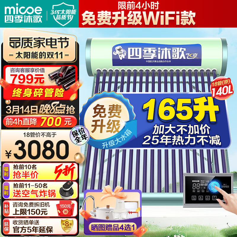 四季沐歌(MICOE)飞享太阳能热水器家用光电两用自动上水 预约电加热 水温水位显示 一级能效 送+装 18管140L价格:3780.00元!