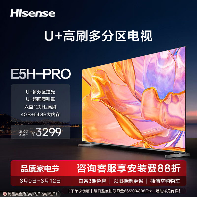 海信电视65E5H-PRO 65英寸 多分区控光 六重120Hz高刷 4K高清智慧屏 液晶智能平板电视机 以旧换新价格:3289.00元!