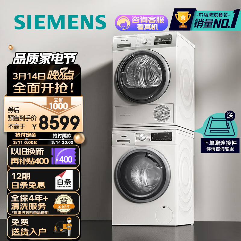 西门子(SIEMENS)洗烘套装 10kg 防过敏 滚筒洗衣机全自动+9kg 除菌烘 热泵烘干机家用 2602W+5601W价格:10099.00元!
